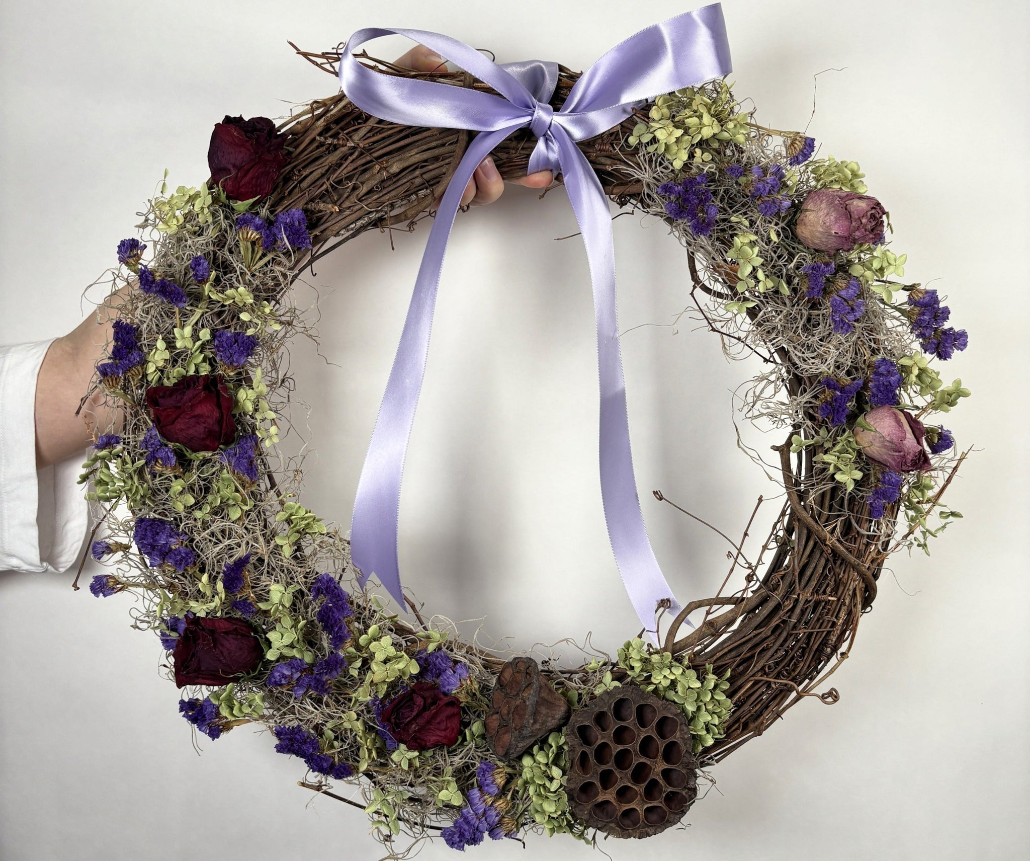 Welcome Spring on your front door or interior decor for years to come with our handmade Spring Wreath! A generously sized 18" wreath is handmade with dried and preserved flowers including Hydrangeas, Red Roses, Limonium, Lotus Pods, Spanish Moss, and more on a natural grapevine base.